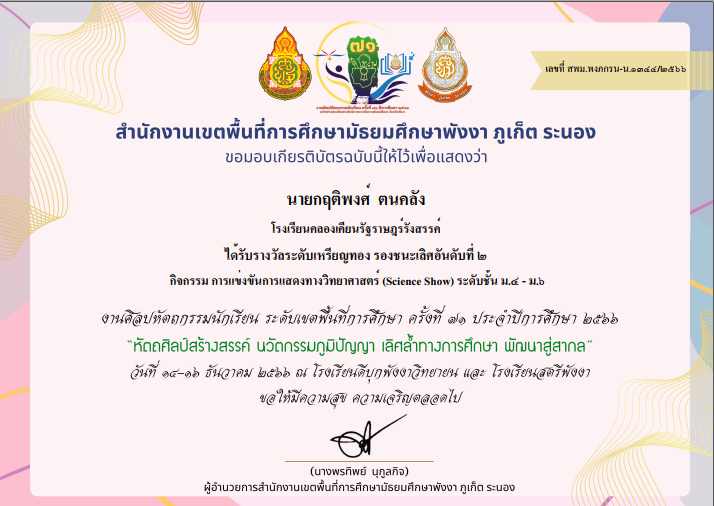 รางวัลระดับเหรียญทอง รองชนะเลิศอันดับที่ ๒ กิจกรรมการแข่งขันการแสดงทางวิทยาศาสตร์ ระดับชั้น ม.๔ - ม.๖