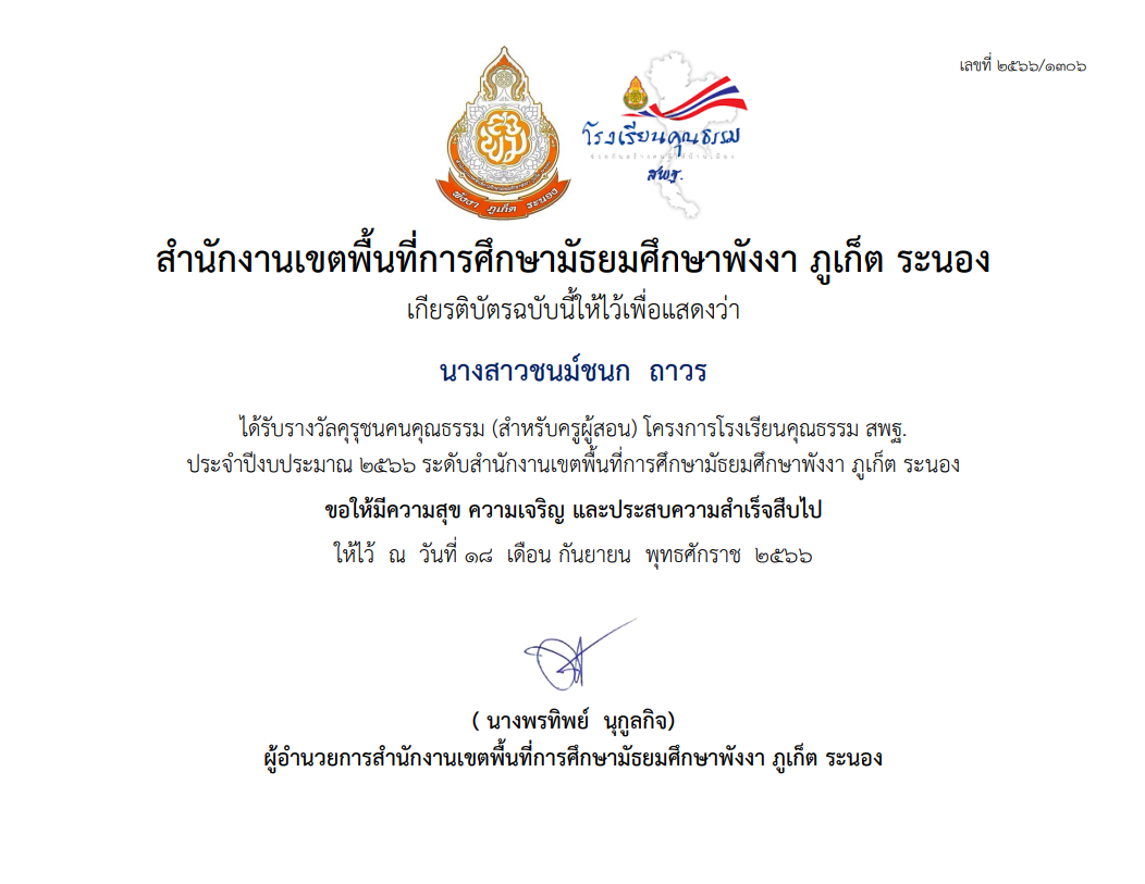ชื่อผลงาน : ได้รับรางวัลคุรุชนคนคุณธรรม (สำหรับครูผู้สอน) โครงการโรงเรียนคุณธรรม สพฐ. ประจำปีงบประมาณ ๒๕๖๖ ระดับสำนักงานเขตพื้นที่การศึกษาพังงา ภูเก็ต ระนอง