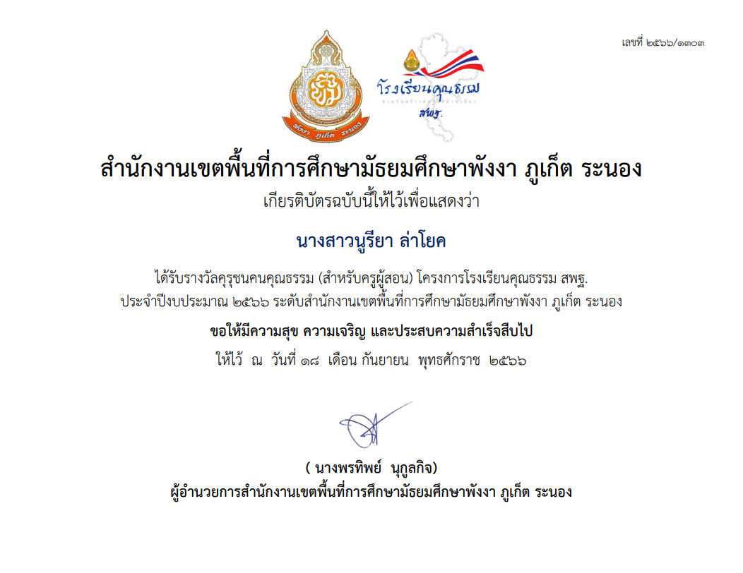 ชื่อผลงาน : ได้รับรางวัลคุรุชนคนคุณธรรม (สำหรับครูผู้สอน) โครงการโรงเรียนคุณธรรม สพฐ. ประจำปีงบประมาณ 2566 ระดับสำนักงานเขตพื้นที่การศึกษาพังงา ภูเก็ต ระนอง