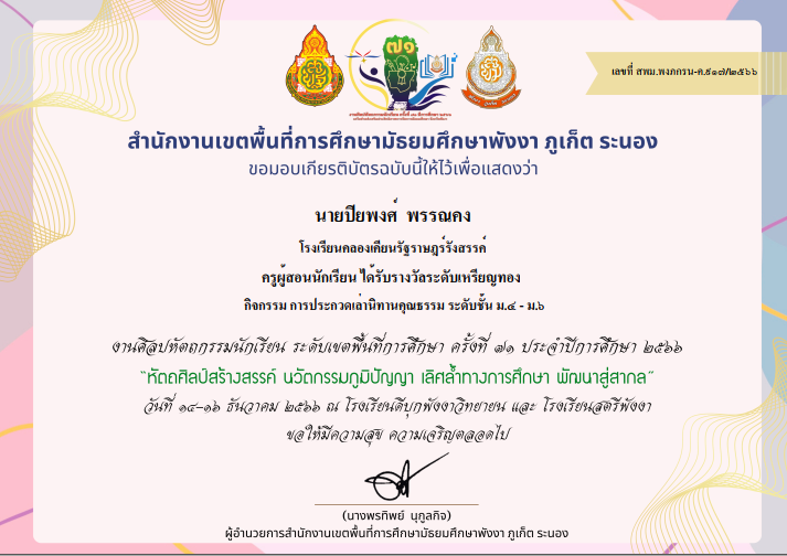 ชื่อผลงาน : ครูผู้สอนนักเรียน ได้รับรางวัลระดับเหรียญทอง กิจกรรมการประกวดเล่านิทานคุณธรรม ระดับชั้น ม.1 - ม.3 งานศิลปหัตถกรรมนักเรียน ครั้งที่ 71 ประจำปีการศึกษา 2566