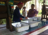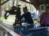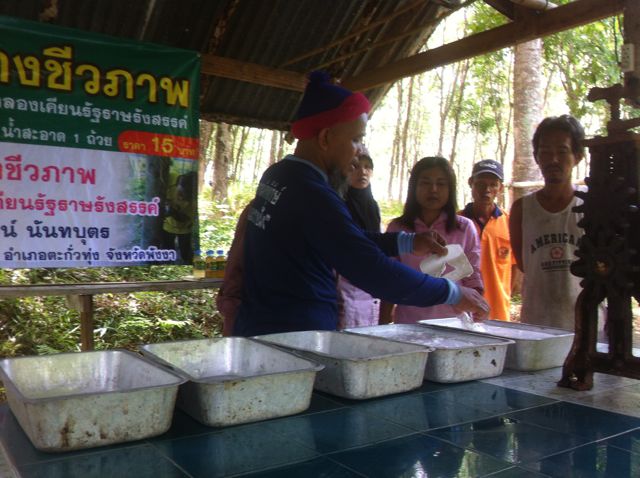 เมื่อวันที่ 24 เมษายน 2557 เวลา 15.00 น. นางสาวสุวิภา ตั้งก่อสกุล รองผอ.สพม.14 พร้อมด้วยนายเสรี บุญทอย ผู้อำนวยการโรงเรียน คณะครู นักเรียน และผู้ปกครองนักเรียนโรงเรียนคลองเคียนรัฐราษฎร์รังสรรค์ ต้อนรับ นายคำรณ หว่างหวังศรี และทีมงานเดินทางมาถ่ายทำสกู๊ปข่าวนำเสนอผลงาน การทำน้ำส้มยาง (พารา) ชีวภาพ ของนักเรียนโรงเรียนคลองเคียนรัฐราษฎร์รังสรรค์ สังกัด สพม.14 น้ำส้มยาง ชีวภาพ เป็นโครงงานที่นักเรียนโรงเรียนคลองเคียนรัฐราษฎร์รังสรรค์ ได้ทดลองและคิดค้นขึ้น โดยวิธีการหมัก กล้วย และสับปะรด มีน้ำและน้ำตาลเป็นส่วนผสม โดยหมักจนมีรสเปรี้ยวจัด แล้วนำไปผสมในน้ำยางพารา เพื่อให้ยางแข็งตัวสำหรับทำเป็นยางแผ่น ซึ่งสามารถใช้แทนน้ำส้มที่ใช้กันอยู่ทั่วไป ประโยชน์ของน้ำส้มยางชีวภาพ คือไม่เป็นอันตรายต่อร่างกาย สามารถหาวัตถุดิบได้จากในท้องถิ่น สร้างมูลค่าให้วัตถุดิบในท้องถิ่น ปัจจุบัน นักเรียนโรงเรียนคลองเคียนรัฐราษฎร์รังสรรค์ สามารถผลิตน้ำส้มยาง ชีวภาพ โดยบรรจุขวด จำหน่ายให้กับชาวสวนยางในชุมชน เป็นการสร้างรายได้ให้กับนักเรียน และประหยัดค่าใช้จ่ายของผู้ปกครองที่ประกอบอาชีพทำสวนยางพารา |