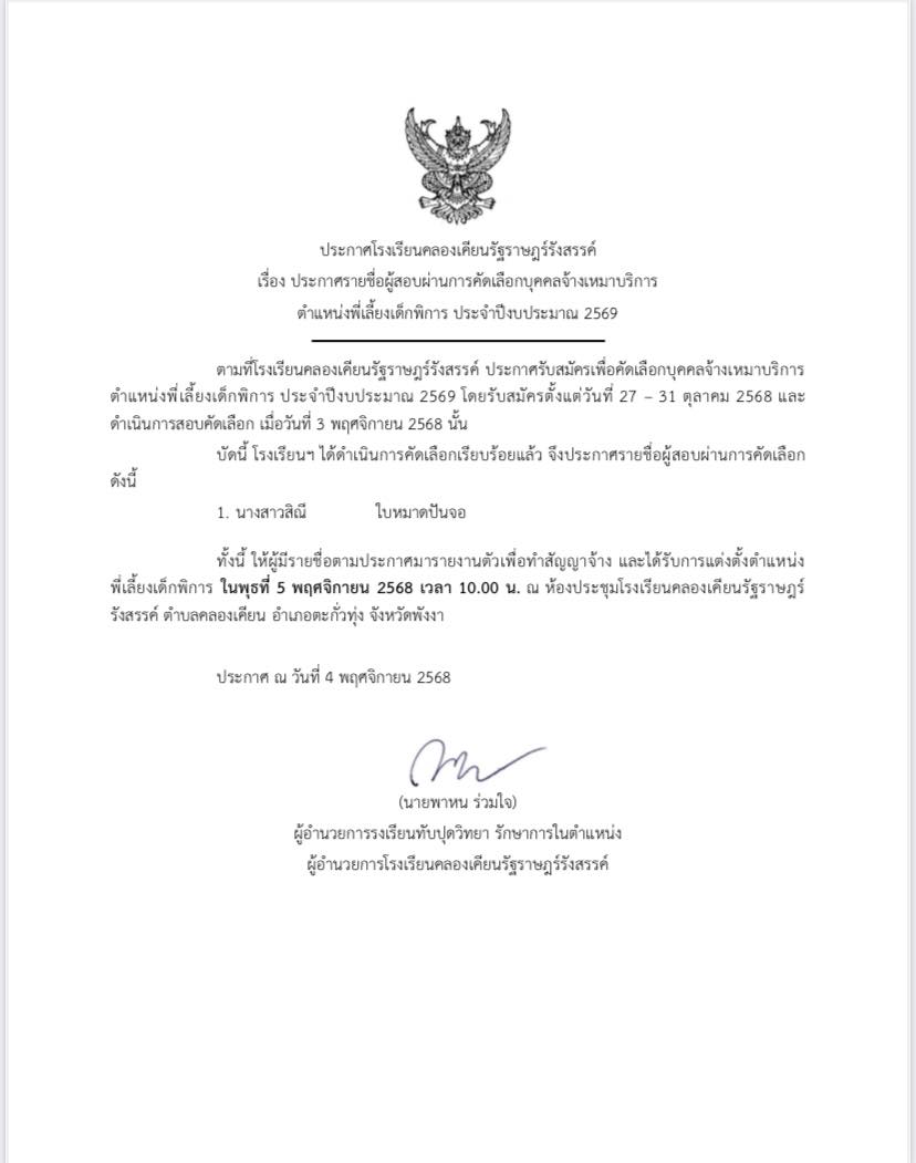 ประกาศรายชื่อผู้สอบผ่านการคัดเลือกบุคคลจ้างเหมาบริการ ตำแหน่งพี่เลี้ยงเด็กพิการ ประจำปีงบประมาณ 2569