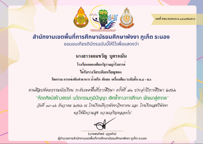 รางวัลระดับเหรียญทองชนะเลิศ กิจกรรมการแข่งขันการวาดภาพระบายสี ประเภทบกพร่องทางร่างกายฯ ระดับชั้น ม.๑ - ม.๓