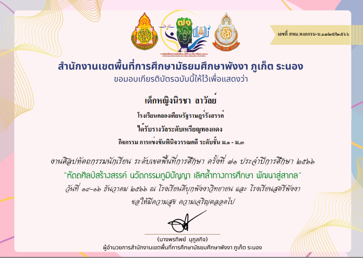 รางวัลระดับเหรียญทองแดง กิจกรรมการแข่งขันพินิจวรรณคดี ระดับชั้น ม.๑ - ม.๓